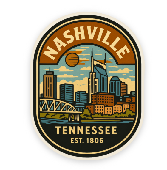 Approximately 3 inches, durable, all-weather sticker designed in Nashville, TN. Die cut with view of Nashville's Skyline. Add it to your laptop, water bottle, and more!