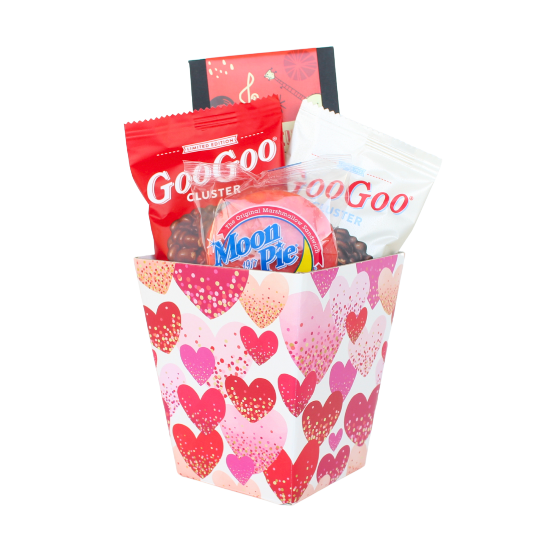 Send your favorite Valentine something sweet from Tennessee! Each heart themed gift container is filled with sweet confections made in Tennessee and wrapped in cello with a raffia bow.