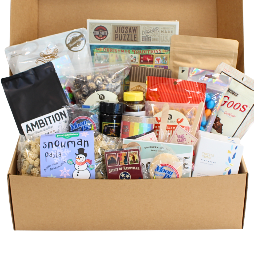 Perfect for sharing with the whole family, this Holiday gift box is filled to the brim with locally made snacks from Nashville, TN along with a few things for the kitchen, a handpoured candle, and holiday puzzle. The ultimate way to spend the Holidays!