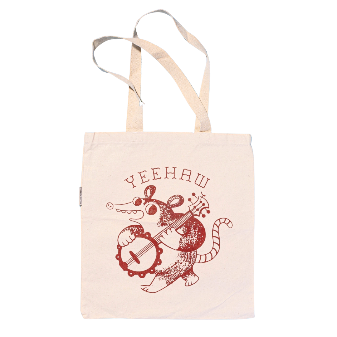 Carry your essentials in style with this Banjo Possum Tote. Crafted from durable canvas, this bag features a possum character strumming a banjo while hollerin' "Yeehaw"!