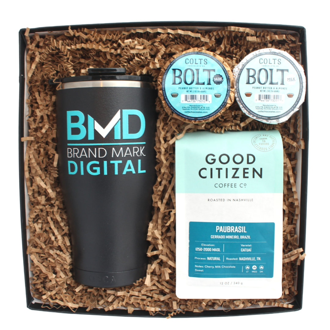 Looking to add branded items with your logo like a mug, coffee, candle, notepad, shirt, or more? We can include items you bring/ship to us or we can help you source branded elements. Contact us for our co-branded catalog of local product options such as coffee, cookies, chocolates, mugs, and more.